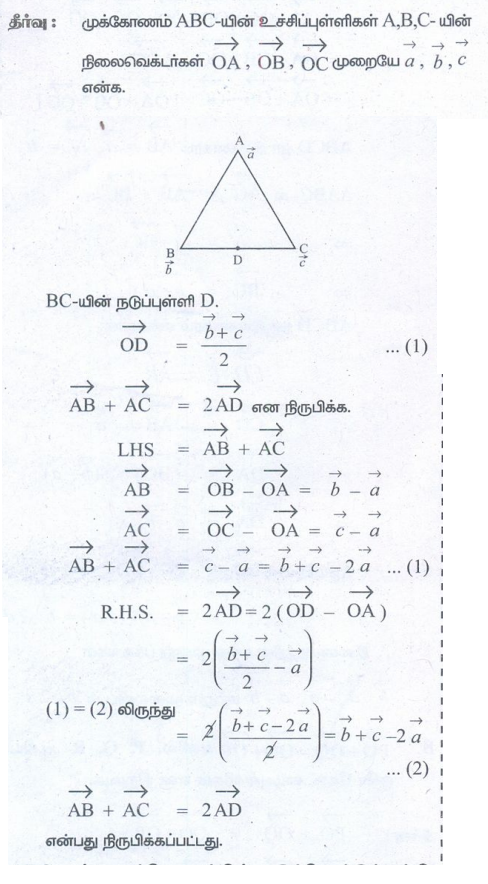 (5) ஒரு முக்கோணத்தின் இரு பக்கங்களின் நடுப்புள்ளிகளைச் சேர்க்கும் நேர்க்கோடு அதன் மூன்றாவது பக்கத்திற்கு இணை எனவும், அதன் நீளத்தில் பாதி எனவும் வெக்டர் முறையில் நிறுவுக.