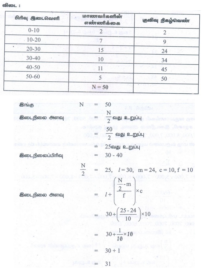 வகுப்பில் தொகுத்தறி மதிப்பீட்டில் மாணவர்கள் எடுத்த மதிப்பெண்களுக்கு இடைநிலை அளவு காண்க.