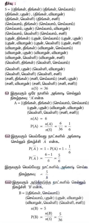 14. இரண்டு நுகர்வோர்கள், பிரியா மற்றும் அமுதன் ஒரு குறிப்பிட்ட அங்காடிக்கு, குறிப்பிட்ட வாரத்தில் (திங்கள் முதல் சனி வரை) செல்கிறார்கள். அவர்கள் அங்காடிக்குச் சமவாய்ப்பு முறையில் ஒவ்வொரு நாளும் செல்கிறார்கள். இருவரும் அங்காடிக்கு, (1) ஒரே நாளில் (2) வெவ்வேறு நாட்களில் (3) அடுத்தடுத்த நாட்களில் செல்வதற்கான நிகழ்தகவுகளைக் காண்க.