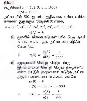 5. ஒரு பொது விழாவில், 1 முதல் 1000 வரை எண்களிட்ட அட்டைகள் ஒரு பெட்டியில் வைக்கப்பட்டுள்ளன. விளையாடும் ஒவ்வொருவரும் ஒரு அட்டையைச் சமவாய்ப்பு முறையில் எடுக்கிறார்கள். எடுத்த அட்டை திரும்ப வைக்கப்படவில்லை. தேர்ந்தெடுக்கப்பட்ட அட்டையில் எண் 500-ஐ விட அதிகமாக உள்ள வர்க்க எண் இருந்தால், அவர் வெற்றிக்கான பரிசைப் பெறுவார். (i) முதலில் விளையாடுபவர் பரிசு பெற (ii) முதலாமவர் வெற்றி பெற்ற பிறகு, இரண்டாவதாக விளையாடுபவர் வெற்றி பெற ஆகிய நிகழ்ச்சிகளுக்கான நிகழ்தகவுகளைக் காண்க.