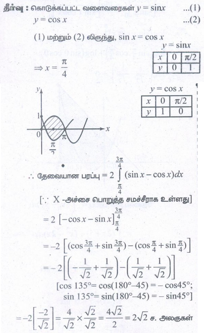 5. வளைவரைகள் y = sin x , y = cos x மற்றும் கோடுகள் x = 0 மற்றும் x = π ஆகியவற்றுக்குஇடையே அடைபடும் அரங்கத்தின் பரப்பைக் காண்க.