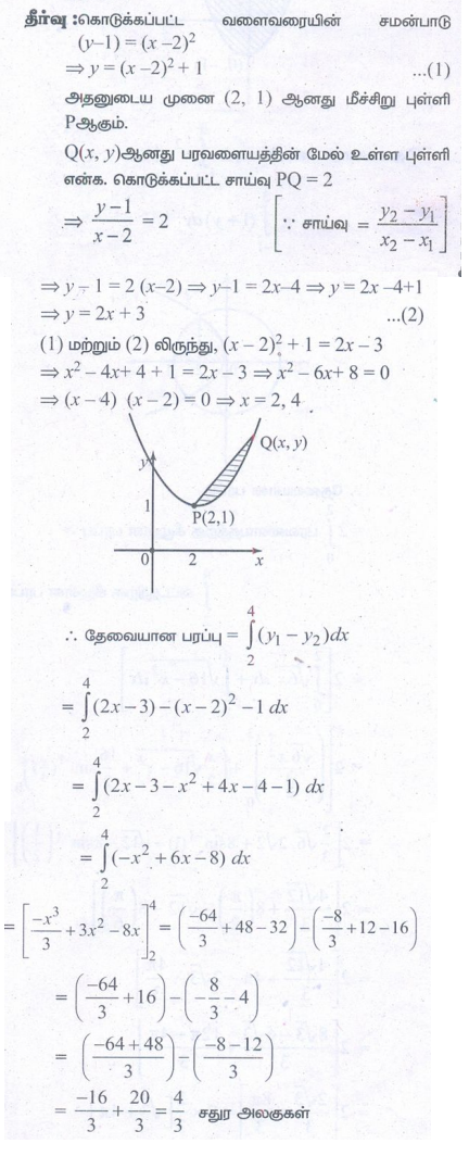 9. P என்பது y = (x – 2)2 + 1 என்ற வளைவரைக்கு ஒரு மீச்சிறு புள்ளி. Q என்ற புள்ளியானது, PO-ன் சாய்வு 2 உள்ளவாறு வளைவரையின் மேல் உள்ளது எனில் வளைவரைக்கும் நாண் PQ-க்கும் இடையில் அடைப்படும் பரப்பைக் காண்க.