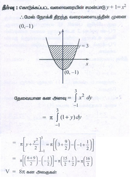 3. x2 = 1 + y மற்றும் y = 3 ஆகியவற்றால் அடைபடும் அரங்கத்தின் பரப்பை y- அச்சைப்பொருத்து சுழற்றுவதால் உருவாகும் திடப் பொருளின் கன அளவைக் காண்க.