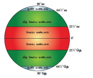 நிலநடுக்கோட்டின் இருபக்கங்களிலும் கடகரேகை மற்றும் மகர ரேகை இடையே அமைந்துள்ள பகுதியே வெப்பமண்டலம் என அழைக்கப்படுகிறது. சூரிய கதிர்கள் செங்குத்தாக விழுவதால் இப்பகு தி அதிக வெப்பமடைகிறது. எனவே காலநிலை வெப்பம் மற்றும் ஈரப்பதமாக இருக்கும். மித வெப்ப மண்ட லம் (Temperate Zone)