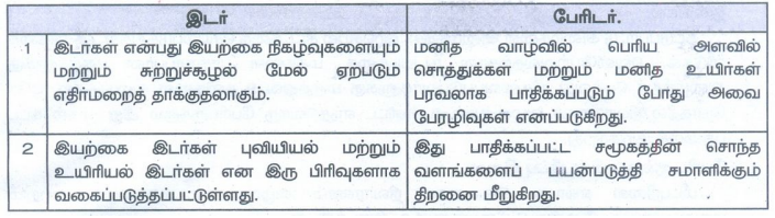 1. மனித வாழ்வில் பெரிய அளவில் சொத்துக்கள் மற்றும் மனித உயிர்கள் பரவலாக பாதிக்கப்படும் போது அவை பேரழிவுகள் எனப்படுகிறது.