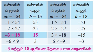 படி 2: acஐ இரு எண்களாகப் பிரிக்க வேண்டும். அவ்வாறு பிரிக்கும்போது எண்களின் கூடுதல் மற்றும் பெருக்கல் முறையே b மற்றும் ac இக்குச் சமமாக இருக்க வேண்டும்.
