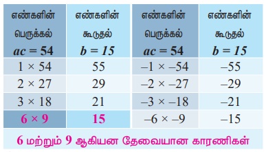 6, 9 என்ற காரணிகள் b = 15 மற்றும் ac = 54 என்பதை நிறைவு செய்வதைக் காண முடிகிறது. மைய உறுப்பை 6x மற்றும் 9x என மாற்றி அமைக்க.