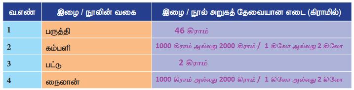 விடை : பருத்தி, கம்பிளி, பட்டு, நைலான்