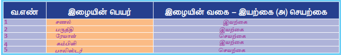 பல இழைகளாவன துண்டுத் துனிகளை, மாணவர்கள் ஒவ்வொருவரையும் தொட்டுப் பார்க்கச் செய்க. ஒவ்வோரு துண்டுத் துணியும், எந்த வகை இழையால் செய்யப்பட்டது என்பதனைக் கண்டறிந்து, அது செயற்கை இழையா அல்லது இயற்கை இழையா என வகைப்படுத்த வேண்டும்.