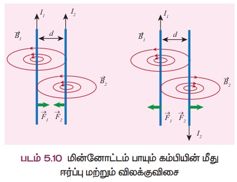 இரண்டு கடத்திகளிலும் எதிரெதிர் திசையில் மின்னோட்டம் பாயுமானால் இரண்டு கடத்திகளின் மீது செயல்படும் விசையும் ஒன்றையொன்று விலக்குமாறு அமையும். இவை படம் 5.10 இல் காட்டப்பட்டுள்ளன.