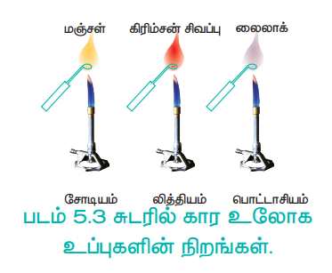 படம் 5.3 சுடரில் கார உலோக உப்புகளின் நிறங்கள்.