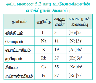 அட்டவணை 5.2 கார உலோகங்களின் எலக்ட்ரான் அமைப்பு