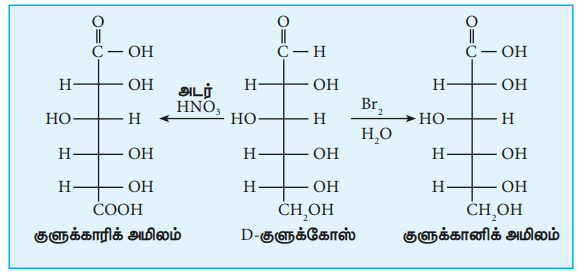 4. குளுக்கோஸ் ஆனது புரோமின் நீர் போன்ற வலிமை குறைந்த ஆக்சிஜனேற்றிகளால் குளுக்கானிக் அமிலமாக ஆக்சிஜனேற்றம் அடைகிறது. இதிலிருந்து, குளுக்கோஸில் உள்ள கார்பனைல் தொகுதியானது ஆல்டிஹைடாக உள்ளது எனவும், மேலும் அது கார்பன் சங்கிலியின் முனையில் அமைந்துள்ளது எனவும் தெளிவாகிறது. அடர் நைட்ரிக் அமிலம் போன்ற வலிமை மிகுந்த ஆக்சிஜனேற்றிகளைக் கொண்டு ஆக்சிஜனேற்றம் செய்யும்போது குளுக்காரிக் அமிலம் ( சாக்கரிக் அமிலம்) கிடைக்கிறது. இதிலிருந்து சங்கிலியின் மற்றொரு முனை ஓரிணைய ஆல்கஹால் தொகுதியால் ஆக்கிரமிக்கப்பட்டுள்ளது என்பது தெளிவாகிறது.