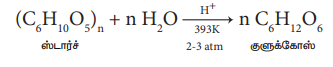2. தொழிற்முறையில், அதிக வெப்பநிலை மற்றும் அதிக அழுத்த நிலைகளில், நீர்த்த HCl கொண்டு ஸ்டார்ச்சை நீராற்பகுப்பதன் மூலமாக குளுக்கோஸ் தயாரிக்கப்படுகிறது.
