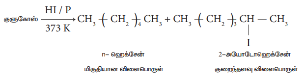 2. 373K வெப்பநிலையில் குளுக்கோஸை அடர் HI மற்றும் சிவப்பு பாஸ்பரஸ் கொண்டு ஒடுக்கும்போது n ஹெக்சேன் மற்றும் 2- அயோடோ ஹெக்சேன் கலந்த கலவை கிடைக்கிறது, இது, குளுக்கோஸிலுள்ள ஆறு கார்பன் அணுக்களும் ஒரே நேர்கோட்டு சங்கிலியாக பிணைக்கப்பட்டுள்ளன என்பதை காட்டுகிறது.
