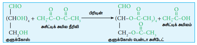 6. குளுக்கோஸ், அசிட்டிக் அமில நீரிலியுடன் வினைப்பட்டு பென்டா அசிட்டேட்டை உருவாக்குகிறது. குளுக்கோஸில் ஐந்து ஆல்கஹால் தொகுதிகள் இருப்பதை இது பரிந்துரைக்கிறது.