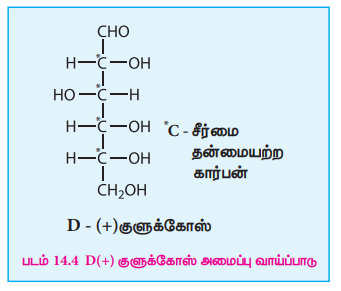 8. எமில் பிஷர் என்பவரால் முன்மொழியப்பட்ட, -OH தொகுதிகளின் மிகச்சரியான புறவெளி அமைப்பானது படம் 14.4 இல் காட்டப்பட்டுள்ளது. D வடிவ அமைப்பை கொண்டிருப்பதாலும், வலஞ்சுழி சுழற்சியை கொண்டிருப்பதாலும், குளுக்கோஸ் மூலக்கூறானது D(+) குளுக்கோஸ் என குறிப்பிடப்படுகிறது.
