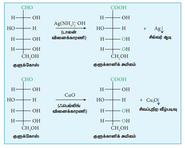 5. குளுக்கோஸ் ஆனது அம்மோனியாகலந்த சில்வர் நைட்ரேட்கரைசல் (டாலன்ஸ்வினைக்காரணி) மற்றும் காரம் கலந்த காப்பர் சல்பேட் கரைசல் (ஃபெல்லிங் வினைக்காரணி) ஆகியவற்றால் குளுக்கானிக் அமிலமாக ஆக்ச்ஜனேற்றம் செய்யப்படுகிறது. டாலன் வினைக்காரணியானது உலோக சில்வராக ஒடுக்கப்படுகிறது, அதேபோல ஃபெல்லிங் கரைசல் குப்பரஸ் ஆக்சைடாக ஒடுக்கப்பட்டு சிவப்பு நிற வீழ்படிவாக மாறுகிறது. குளுக்கோஸ் மூலக்கூறில் ஆல்டிஹைடு தொகுதி உள்ளதை இந்த வினைகள் மேலும் உறுதிபடுத்துகின்றன.
