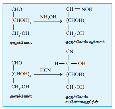 3. குளுக்கோஸ், ஹைட்ராக்ஸிலமின் உடன் வினைப்பட்டு ஆக்சைம் மற்றும் HCN உடன் வினைப்பட்டு சயனோஹைட்ரின் ஆகியவற்றை உருவாக்குகிறது. குளுக்கோஸ் மூலக்கூறில் கார்பனைல் தொகுதி இருப்பதை இவ்வினைகள் காட்டுகின்றன.