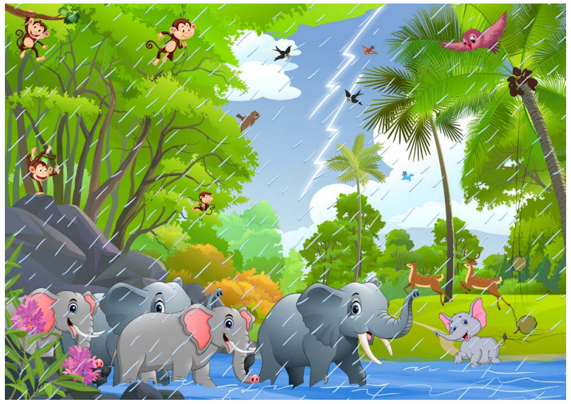சடசடவென மழை பெய்ய, குரங்குகள் மரத்தின் மீது மடமடவென ஏறின.