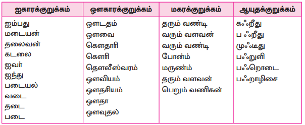 ஐகார, ஔகார, மகர, ஆய்தக்குறுக்கங்களுக்கு எடுத்துக்காட்டாக அமையும் சொற்களைத் தொகுத்து எழுதுக.