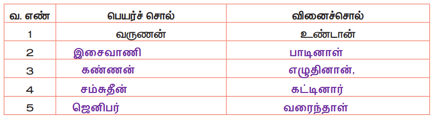 (பாடினாள், வருணன், எழுதினான், வரைந்தாள், இசைவாணி, உண்டான், கண்ணன், சம்சுதீன், ஜெனிபர், கட்டினார், ஓடியது, முயல்)