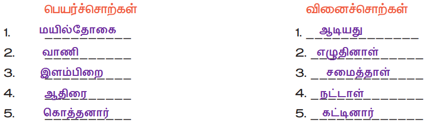 ஆ. பின்வரும் தொடர்களில் உள்ள பெயர்ச்சொல், வினைச்சொல்லை எடுத்து எழுதுக.