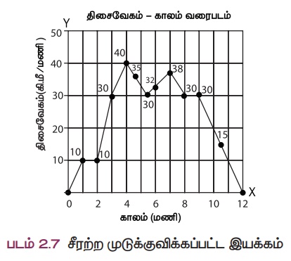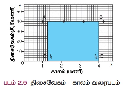 மகிழுந்தின் இயக்கத்திற்கான திசைவேகம்காலம் வரைபடம் படம் 2.6 ல் காட்டப்பட்டுள்ளது. சம கால இடைவெளியில் திசைவேகமானது சம அளவு மாறுபடுவதை வரைபடம் காட்டுகிறது. ஆகவே,