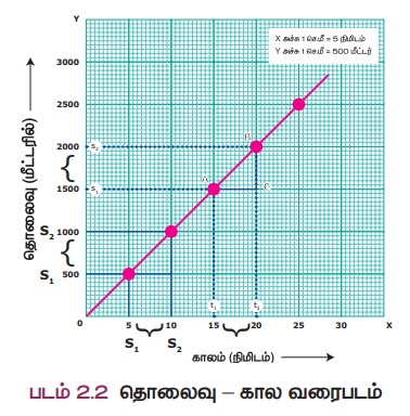 கடந்த தொலைவு மற்றும் எடுத்துக் கொண்ட நேரம் ஆகியவற்றிற்கான ஒரு வரைபடத்தை நாம் வரைந்தால் அது படம் 2.4 ல் காட்டப்பட்டுள்ளவாறு அமையும்.