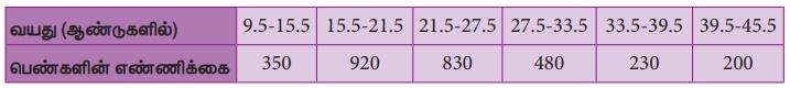 ஒரு நகரத்தில் 10 முதல் 45 ஆண்டுகள் வயது வரையுள்ள படித்த பெண்களின் எண்ணிக்கை கீழ்க்காணும் அட்டவணையில் கொடுக்கப்பட்டுள்ளது.