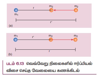 m1 மற்றும் m2 என்ற இரு நிறைகள் ஆரம்பத்தில் r' தொலைவில் உள்ளன. m1 நிறையானது நிலையாக உள்ளது என்க. நிறை m2 ஐ r' நிலையில் இருந்து r நிலைக்கு 6.12 (a) இல் காட்டியுள்ளபடி நகர்த்த வேலை செய்ய வேண்டும்.