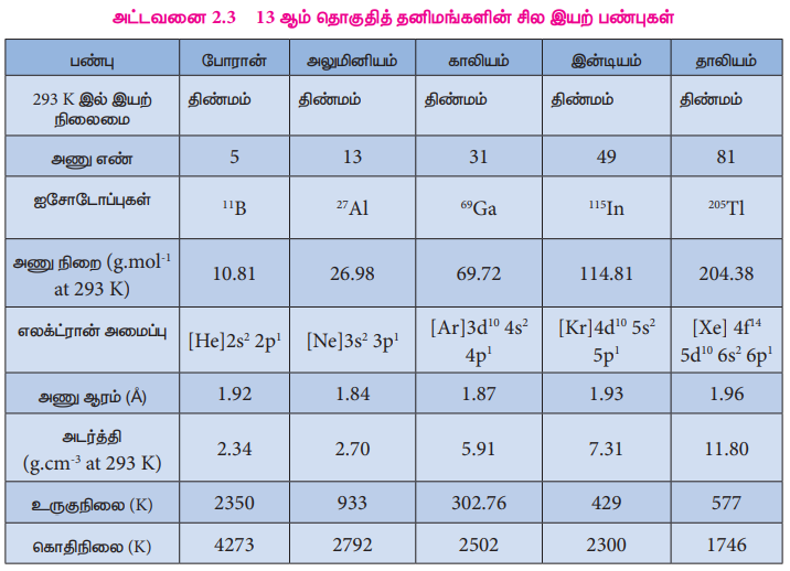 அட்டவனை 2.3 13 ஆம் தொகுதித் தனிமங்களின் சில இயற் பண்புகள்