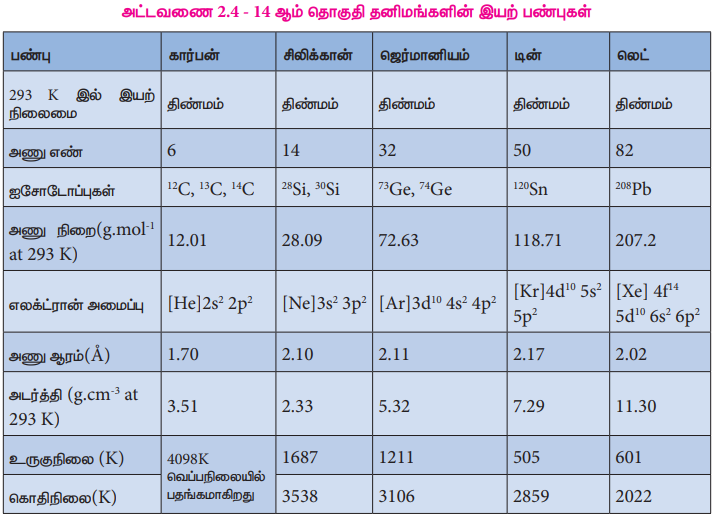 அட்டவணை 2.4 - 14 ஆம் தொகுதி தனிமங்களின் இயற் பண்புகள்