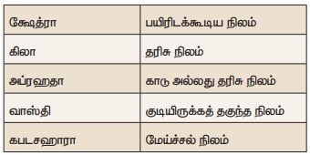 பஹார்பூர் செப்பேடு அரசர்தான் நிலத்தின் ஒரே உரிமையாளர் என்று காட்டுகிறது. நில மானியங்கள் தரும் போதும், அதன் மீதான தனியுரிமையைத் தன்னிடமே அவர் வைத்துக் கொண்டார். தனிப்பட்ட நிலங்களின் இடமும் எல்லைகளும் ஆவணக் காப்பாளர்களாலும், அப்பகுதியின் செல்வாக்கு மிக்கவர்களாலும் அளந்து குறித்து வைக்கப்பட்டன. பஹார்பூர் செப்பேடுகளின்படி உஸ்தபாலா என்ற அதிகாரி மாவட்டத்தின் நிலப் பரிமாற்றம் தொடர்பான ஆவணங்கள் அனைத்தையும் பாதுகாத்தார். கிராமத்தில் நிலங்கள் தொடர்பான ஆவணங்களை கிராம கணக்கர் பராமரித்தார். குப்தர் காலத்தில் நிலம் கீழ்வருமாறு வகைப்படுத்தப்பட்டிருந்தன.