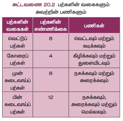 அட்டவணை 20.2 பற்களின் வகைகளும் அவற்றின் பணிகளும்
