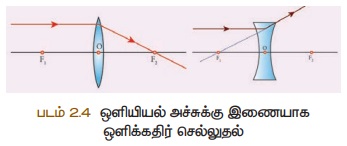 மீது விழும் ஒளிக்கதிர்களும் விலகலடைந்த பிறகு முதன்மை அச்சுக்கு இணையாகச்