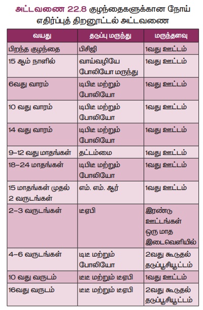 1970 ஆம் ஆண்டு உலக சுகாதார நிறுவனம் குழந்தைகளுக்கான நோய் எதிர்ப்பு திறனூட்டல் அட்டவணையை வழங்கியிருக்கிறது. இந்த அட்டவணையானது அனைத்து நாடுகளிலும் செயல்படுத்தப்படுகிறது. குழந்தைகளை தொற்றுநோய்களிலிருந்து பாதுகாப்பதற்காக எந்த வயது குழந்தைக்கு எந்த தடுப்பு மருந்தை வழங்குதல் வேண்டும் என்பதைச் சுட்டிக்காட்டுகிறது. இந்தியாவில் பின்பற்றப்படும் நோய் எதிர்ப்பு தடுப்புத் திறனூட்டல் அட்டவணையானது அட்டவணை 22.8ல் கொடுக்கப்பட்டுள்ளது.