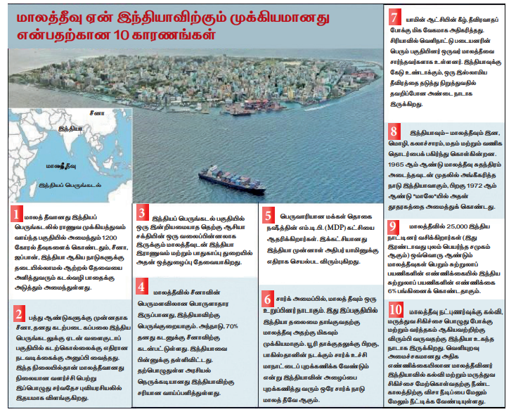 மாலத்தீவு லச்சத்தீவிலிருந்து 700 கி.மீ தொலைவிலும், இந்திய பிரதான இடத்திலிருந்து 1200 கி.மீ தொலைவிலும் அமைந்துள்ளது. மேலும் சீனாவின் இருப்பு, இந்தியாவிற்கு மாபெரும் அச்சுறுத்தலை விளைவிக்கிறது.