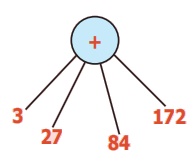 நான்கு எண்களைக் கூட்டல் குறியீட்டில் இதே போல் எழுதலாமா? ஆம். மரவுரு வரைபடத்தில் 4 எண்களின் கூடுதலை இவ்வாறு எழுதலாம்.