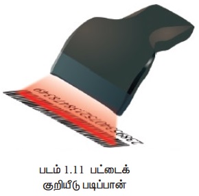 (9) பட்டைக் குறியீடு / கியூ. ஆர் பட்டை படிப்பான் (Bar Code / QR Code Reader) : பட்டைக் குறியீடு என்பது வெவ்வேறு தடிமன் வரிசையில் அச்சிடப்படும் ஒரு வடிவம் ஆகும். பட்டை குறியீட்டு படிப்பான், பட்டைக் குறியீட்டைப் படித்து அவற்றை மின் துடிப்புகளாக (electric pulses) மாற்றி கணிப்பொறி செயலகத்திற்கு அனுப்பும் ஒரு கருவியாகும். கணிப்பொறியில் தகவலை விரைவாகவும் பிழையின்றி பதிவு செய்யவும் இது பயன்படுகிறது.