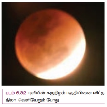 புவியின் கருநிழல் பகுதியில் நிலா உள்ளபோது சிவப்பு நிறத்தில் நிலா தெரியும். புவியின் கருநிழல் பகுதியினை விட்டு நிலா வெளியேறிய உடனே அது பிறைநிலவு போல தோன்றும். அவ்வாறு நிலா வெளியேறும்போது டிஜிட்டல் கேமரா மூலம் எடுக்கப்பட்ட நிழல் படத்தை (படம் 6.32) பார்க்கவும்.