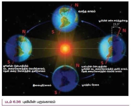 சூரியனை புவி நீள்வட்டப்பாதையில் சுற்றுகிறது. எனவே சூரியனுக்கு அண்மையில் புவி உள்ளபோது கோடைகாலமும் சேய்மையில் உள்ளபோது குளிர்காலமும் தோன்றுகிறது என்பது தவறான கருத்தாகும். உண்மையில் புவியானது சூரியனை 23.5° கோண சாய்வுடன் சுற்றி வருவதாலேயே பருவ காலங்கள் தோன்றுகின்றன’. இது படம் 6.36 ல் காட்டப்பட்டுள்ளது.