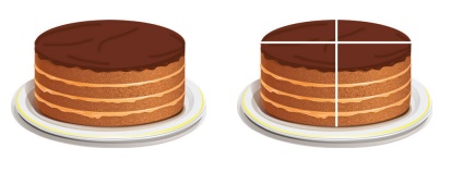 இராஜா தன்னுடைய நான்கு குழந்தைகளுக்காக இனிப்பப்பம் (cake) வாங்கினார். அவர் அதை நான்கு சமபாகங்களாக வெட்டினார். பின்னர் அதனைத் தன் குழந்தைகளுக்குக் கொடுத்தார். அவர்களும் அதனை மகிழ்ச்சியாக உண்டனர்.