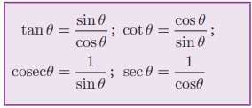 மேற்கண்ட இரண்டு முக்கோண விகிதங்களிலிருந்து மற்ற நான்கு முக்கோணவியல் விகிதங்களைப் பின்வருமாறு எழுதலாம்.