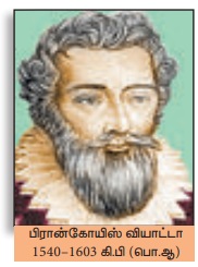 பிரஞ்சு கணித மேதை பிரான்கோயிஸ் வியாட்டா இயற்கணிதச் சமன்பாடுகளைத் தீர்ப்பதற்குப் பொருத்தமான முக்கோணவியல் சார்புகளைப் பயன்படுத்தினார். அவருடைய புகழ்பெற்ற π சூத்திரமானது முக்கோணவியல் விகிதங்களைப் பயன்படுத்துவதன் மூலமாகப் பெறப்பட்டது. அவர் இயற்றிய "Canon Mathematics" என்ற புகழ்மிக்க நூல் முக்கோணவியல் பற்றி விவரிக்கிறது. மேலும் இந்நூல் முக்கோணவியல் சார்ந்த அட்டவணைகளைக் கணித ரீதியாக எவ்வாறு உருவாக்கலாம் என்ற குறிப்பையும் தள மற்றும் கோள முக்கோணங்களின் தீர்வைப்பற்றியும் கூறுகிறது. அதிகபட்சம் அறுபடித்தான சமன்பாடுகளுக்குத் தீர்வு காண்பது, மூலங்களைக் கண்டறிவது ஆகிய முறைகளைக் கோயிஸ் அளித்துள்ளார். கணிதத்தில் ‘கெழு’ என்ற சொல்லை முதன் முதலில் பயன்படுத்தியவர் இவரே. சமன்பாடுகளின் மூலங்களுக்கும், கெழுக்களுக்கும் இடையேயுள்ள தொடர்பை, ஒரு சாதாரணச் சூத்திரத்தின் மூலம் இவர் நமக்கு விளக்கியுள்ளார். மேலும், வடிவியல் முறையில் கனச் சதுரத்தை இரு மடங்காக்குவது, ஒரு கோணத்தை மூன்று சமபாகமாகப் பிரிப்பது போன்ற கணக்குகளையும் இவர் வழங்கியுள்ளார். இரகசியக் குறியீடு செய்திகளிலிருந்து தேவையான செய்தியைக் கண்டறியும் கணித முறையை வழங்கியுள்ளார்.