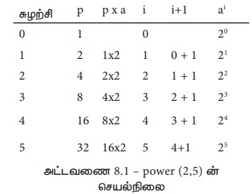 power (a, n) என்ற நெறிமுறை a- யை ஒட்டுமொத்தமாக 'n' முறை பெருக்கி an ஐ கணக்கிடுகிறது.