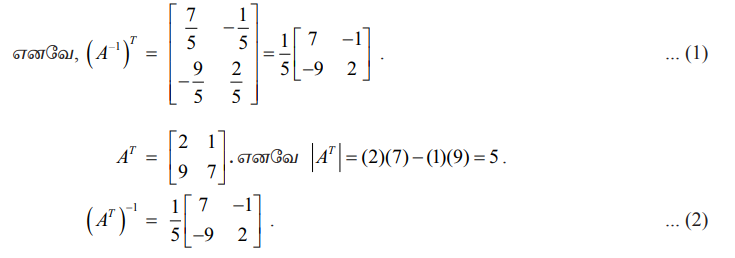 (1) மற்றும் (2)−லிருந்து கிடைப்பது, (A−1)T = (AT)−1. எனவே கொடுத்துள்ள பண்பு சரிபார்க்கப்பட்டது.