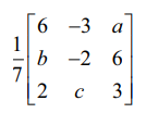 என்பது செங்குத்து அணி எனில் a, b மற்றும் c களின் மதிப்பைக் காண்க. இதிலிருந்து A−1 −ஐக் காண்க.