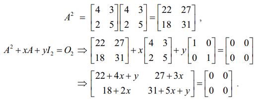 எனவே x = −9 மற்றும் y = 14. பின்பு நமக்குக் கிடைப்பது A2 − 9A + 14I2 = O2.