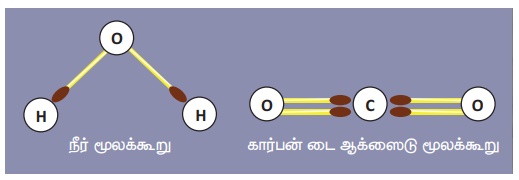 நீர் (H2O) மூலக்கூறில் இரண்டு ஹைட்ரஜன் அணுக்களும் ஒரு ஆக்சிஜன் அணுவும் உள்ளன.